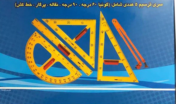 1:نقاله: در این ست ترسیم یک نقاله وجود دارد. یکی از مباحث ریاضی دوره ابتدایی اندازه گیری زوایا است. نقاله ابزاری است که در آموزش زوایا بسیار کاربرد دارد. دانش آموزان که تا حالا از نقاله استفاده نکرده اند برای اولین بار نقاله را میبینند و کار کردن باهاش را یاد میگیرند. نقاله موجود در ست ترسیم امکان استفاده برروی کلیه سطوح را دارد.