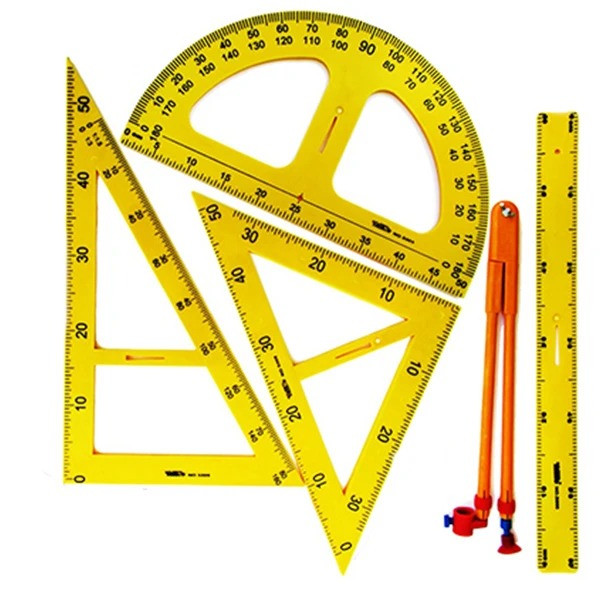 2:گونیا: یکی دیگر از ابزارهای سری ترسیم گونیا است که بسیار در مبحث زاویه 45 درجه و مثلث کاربرد دارد. همچنین در این گونیا یک ذوزنقه وجود دارد که امکان رسم دقیق و مناسب و آسان تر اشکال هندسی را برای دانش آموزان فراهم میکند.